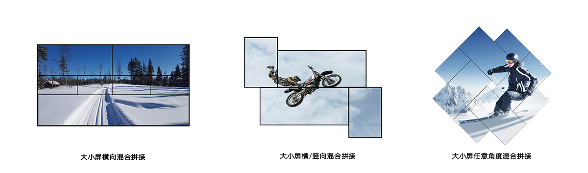 支持任意角度(0-360)旋转和任意间距创意拼接,支持大小屏混合拼接,支持LED/LCD/投影混合拼接